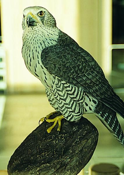 The territorial bird is the gyrfalcon (Falco rusticolus). It became the official bird of the Northwest Territories in 1990. The gyrfalcon is the largest and most magnificent of the falcons and breeds throughout the tundra, including all the Arctic islands. Gyrfalcons usually winter in the North and during that season can be found anywhere in the Northwest Territories. They range in color from white through shades of grey and brown to almost black. Darker birds are more common in the NWT. Gyrfalcons eat mostly ptarmigan, but also ground squirrels, seabirds, waterfowl, and arctic hares. They are expert hunters, and extremely fast and powerful fliers.